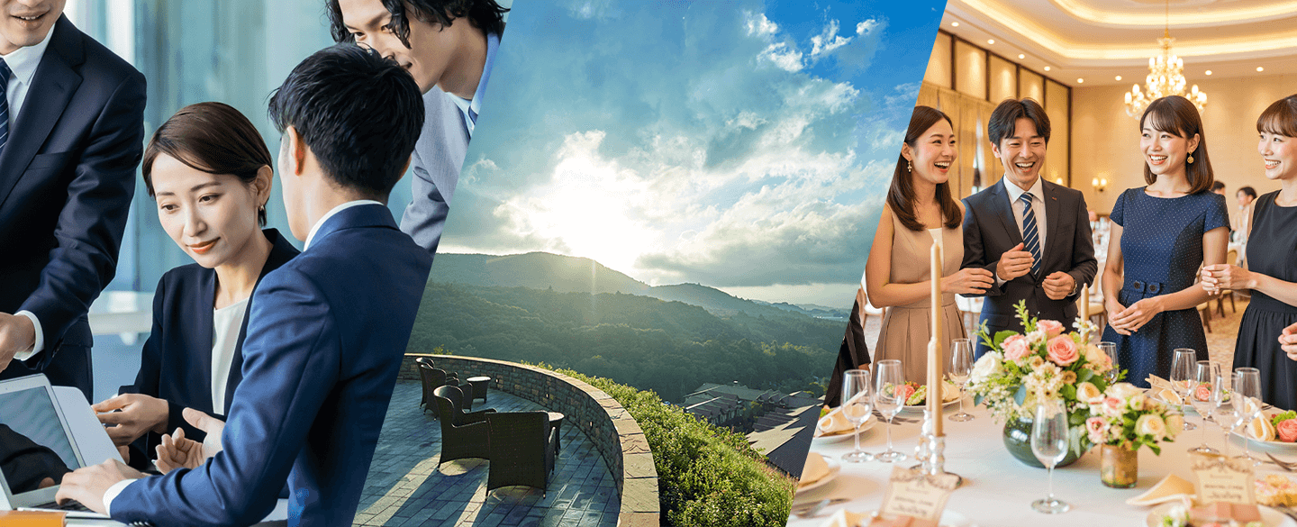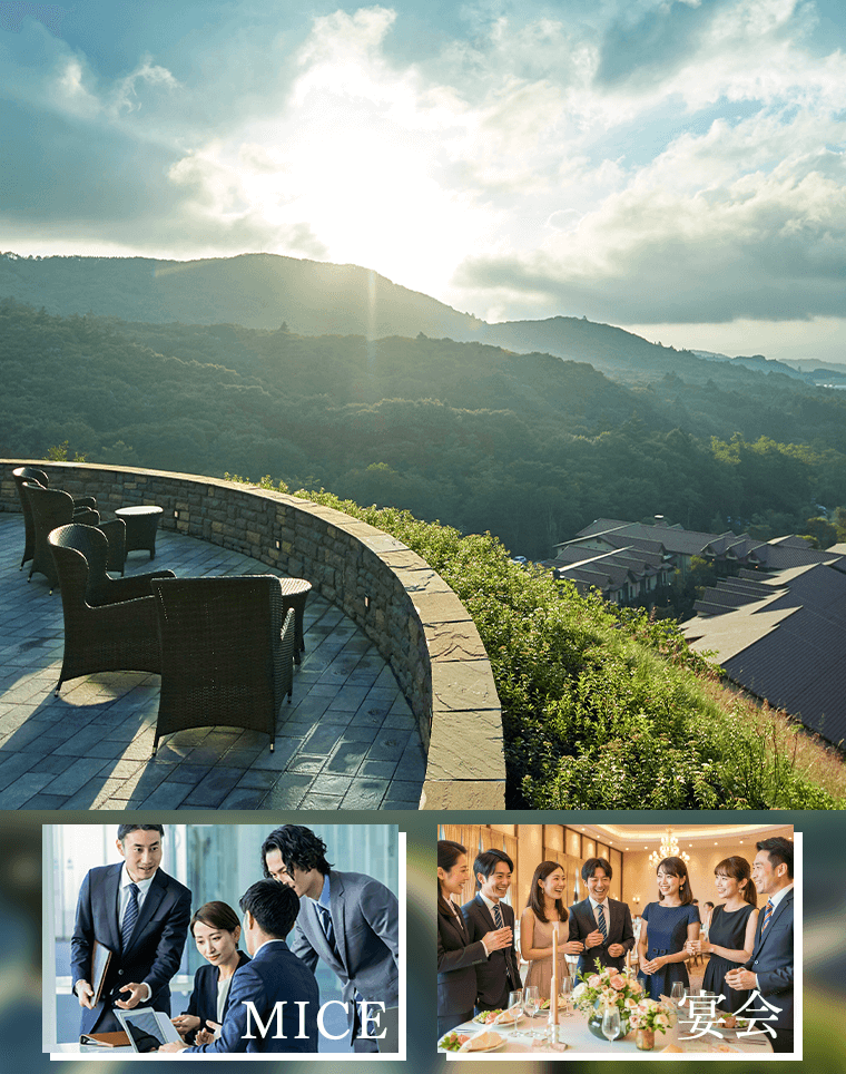 専用の展望テラスでは、浅間山を背景にしたカクテルパーティーやレセプションも可能。特別な時間を演出できる空間です。- 広さ
